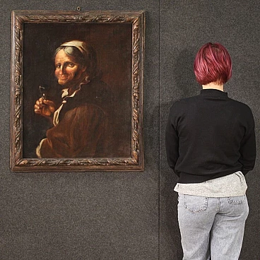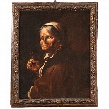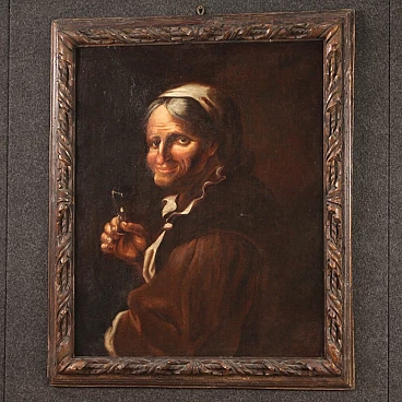 Lombard/Venetian painting from the 17th century. Oil-on-canvas work depicting portrait, grotesque tavern character with glass of excellent painterly hand. Painting of beautiful size and proportion adorned with a wooden frame, not contemporary, pleasantly carved, with some small signs of time (see photo). A painting of great character, note the character's hand of clear Caravaggesque inspiration and the excellent transparency of the glass, a work for antique dealers, interior decorators and collectors of high period Italian painting. Painting that has undergone conservative restoration, re-staining, frame replacement and colour restoration in places (see photo). Work in overall good condition with some minor signs of time. Light painting H 72 x W 58 cm.