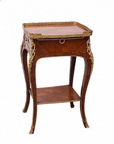 Napoleon III French coffee table in exotic precious woods with gilded bronze fittings. The quadrangular top is enriched by a bronze railing entirely pierced. The underside of the table top features a writing tablet covered with green, skilfully chiselled leather. A bronze drawer is concealed at the side, which can be pulled out by a bronze handle. The four cabriole feet are joined by a rectangular shelf and end with bronze socks. Condition: Very good condition. Provenance: 19th century France. Measurements: 42x34 H70cm. Document: Certificate of Authenticity.