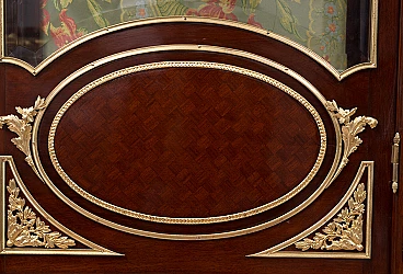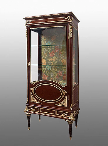 Napoleon III solid mahogany display cabinet from the second half of the 19th century. The front of the door has a medallion with a geometric inlay surrounded by a bronze frame. The side panels have the same motifs as the front. The band under the top is richly adorned with bronze appliqués also found on the base, which in turn rests on fluted truncated cone feet. The marble top and key are original to the period. Provenance: France (1860/70) Condition: Restored and upholstered by our master craftsmen using traditional handmade shellac and alcohol method. Measurements: 75x40 H175cm. Document: Certificate of Authenticity.