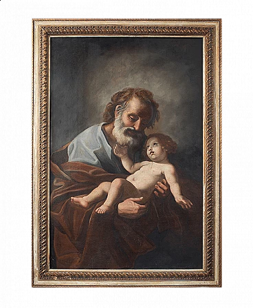 Antique oil painting on canvas depicting Saint Joseph with Child. The painting is a great innovation: Joseph is portrayed alone with the baby Jesus in his arms. Such a representation was reserved for Mary. In the history of art he was usually portrayed as an old man (as is also the case in this work), in order to remove any suspicion that he was involved in the procreation of the child. For this reason he was almost always physically detached from Mary. The importance and quality of this splendid work is so evident that it will satisfy even the most experienced and demanding collector. Great expressive power and emotion but also balance and tenderness come together in this pictorially perfect scene. Our canvas is completely identical both in the full-bodied brushstrokes and in the colouring, it is in perfect condition and above all in first canvas. Condition: Excellent Condition frame not contemporary. External measures: 100x140cm. Frame measurements: 85x125cm. Provenance: 18th century Naples. Document: Certificate of Authenticity.