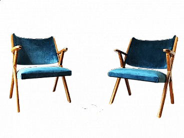 Pair of compass armchairs in wood and velvet. Seat height: 40cm.