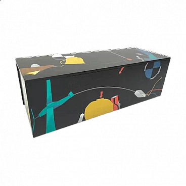 Good Memory chest in black screen-printed wood by Emilio Tadini for Interflex, 1987.