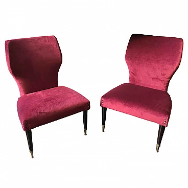 Pair of small armchairs in burgundy velvet, with wooden legs and final brass. Original 50's, have been restored, padding and upholstery are perfect.