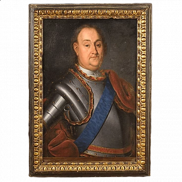 Piedmontese school, portrait of nobleman in armor, oil painting on canvas, 1700s