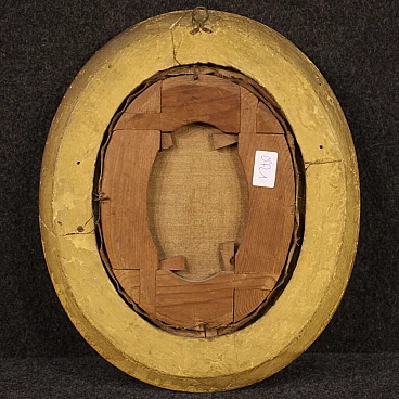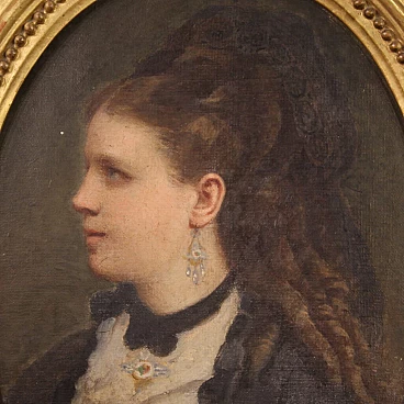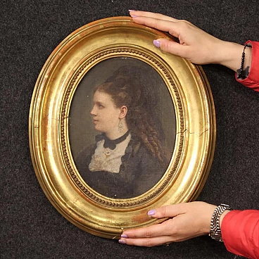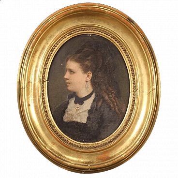 Antique Italian painting from the 19th century. Oil painting on canvas, first canvas, depicting female portrait, young maiden in elegant dress with a good painterly hand. Coeval wood and plaster frame nicely carved and gilded with several signs of time (see photo). The frame has been restored and fixed with screws and nails (visible from the back). Canvas in good condition and with beautiful patina, for antique dealers, interior decorators and antique portrait collectors. Small-sized canvas that can easily be placed in various places in the home. Canvas has undergone slight conservation restoration, painting overall in fair condition. Light painting H 24 x W 18 cm.