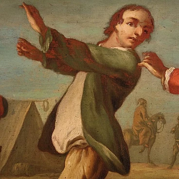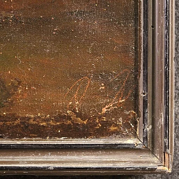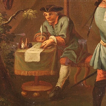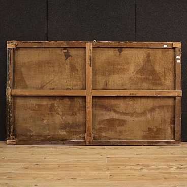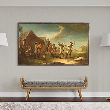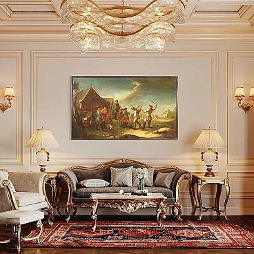 Antique French painting from the 19th century. Work oil on canvas, on the first canvas, depicting a view of a camp with soldiers and horses of good pictorial quality. A painting that develops horizontally, of great measure and dynamism, full of characters, animals and decorative elements. Twentieth century frame, in wood and plaster, carved and ebonized, applied and fixed frontally to the painting (see photo). Painting of good brightness and pleasant depth, for antique dealers, interior decorators and collectors of antique military-themed works. Canvas with a difficult to read monogram in the lower right corner (see photo). Work that has undergone a conservative restoration, replacement of the frame, addition of small patches on the back and color recovery in some places (see photo). In nice patina, overall in good state of conservation with some signs of aging. Light painting H 102 x L 175 cm.