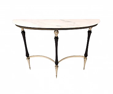 This wall console features an ebonized beech structure, brass parts and feet and a Portuguese pink marble top. It was built in the 1950s.