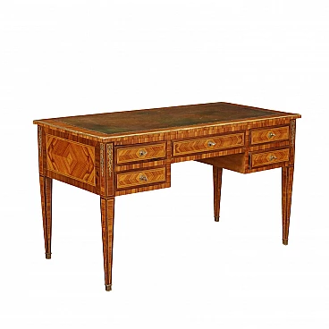 Neoclassical-style open desk supported by pyramidal legs with brass feet. The front features two side drawers and one undermounted drawer veneered in bois de rose with maple and stained maple fillets adorned with bronze appliqués. The top features a faux morocco insert.