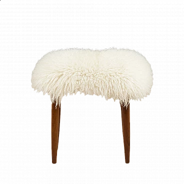 This Danish footstool was designed in the 1960s and is upholstered with natural long-haired white sheepskin. The legs are tapered in solid teak and are removable. The piece is thin and delicate, it is not recommended for a heavy person.