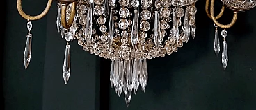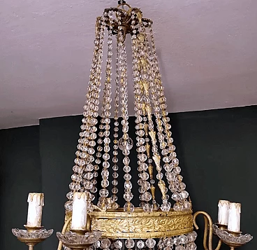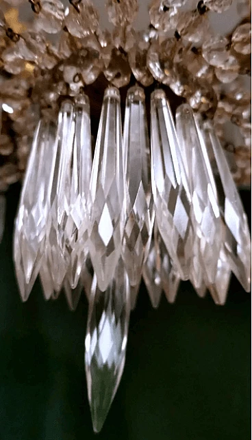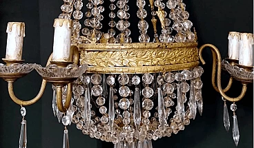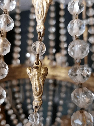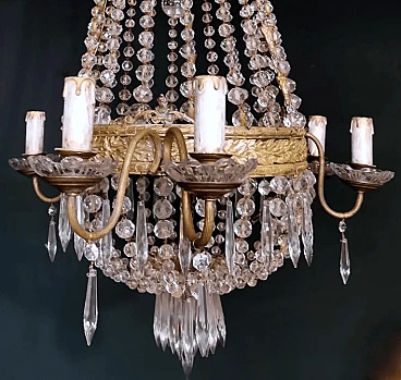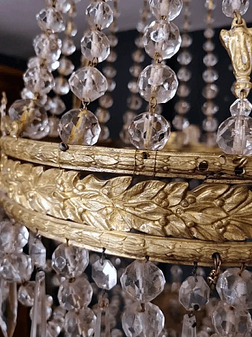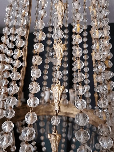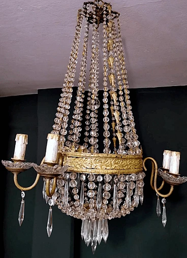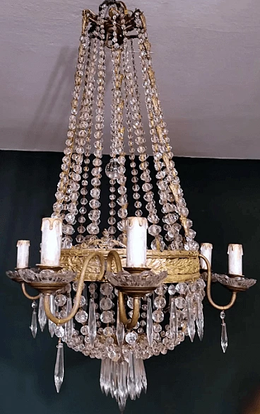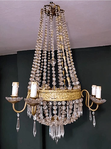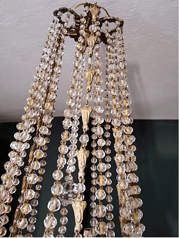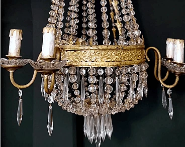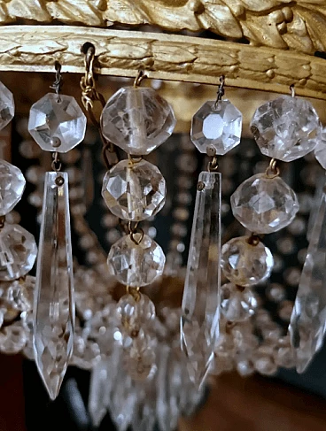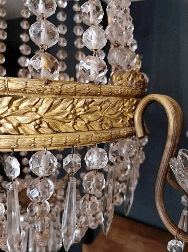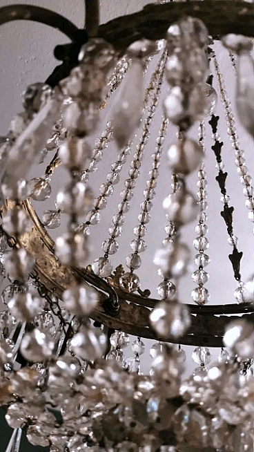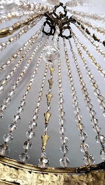 This chandelier has the classic balloon shape typical of the Louis XVI style; the strands of crystals of different shapes, manually joined together, are distributed and hung on a structure that resembles the shape of a basket (hence the French name sac-à-perle); the central band is in gilded brass and is enriched with laurel branch decorations; four curvilinear arms, also in gilded brass, applied to the external part of the structure, have at their ends the points of light, made up of crystal bobeches that support fake candles; from the lower part hangs a group of massive crystals in the shape of an arrow; inside the upper part of the chandelier there is a string of crystals at the end of which hangs a crystal ball. The chandelier was created entirely by hand by a craftsman between 1870 and 1890 near Paris.