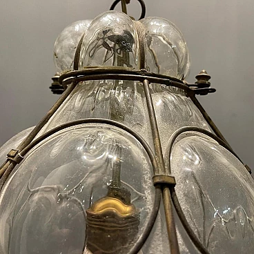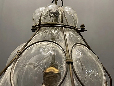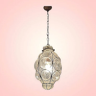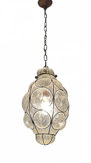 Hand-blown Murano glass with wrought iron frame. Features 1 light. Requires E27 bulb. New wiring installed compatible with USA Europe UK. Height without chain and ceiling canopy 45 cm Height with chain and ceiling canopy 100 cm Width 30 cm