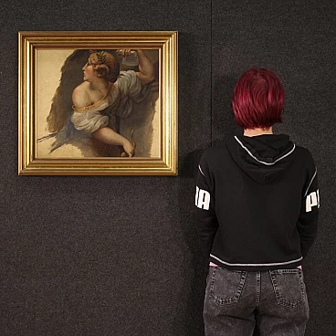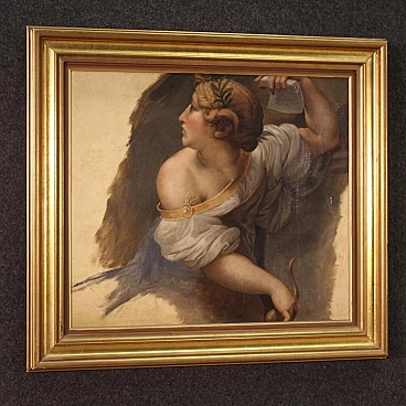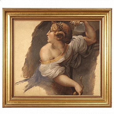 Antique French painting from the second half of the 19th century. Oil on paper work applied to canvas depicting young maiden, Sibyl of good painterly hand. Modern wood and plaster frame, carved and gilded, of beautiful decoration. Painting that focuses on the lady's clothes and her pose with unfinished background, for antique dealers, interior decorators and collectors. Painting of excellent proportion and pleasing decoration, easily placed in various places in the home. Work on paper that was applied to canvas on a wooden frame during the 20th century. In good condition with some minor signs of time. Light painting H 42 x W 48 cm.