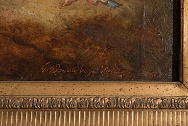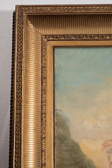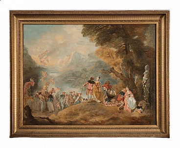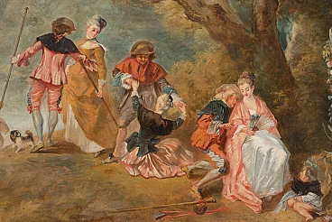 Painting depicting a leisure moment of French aristocracy, anonymous master of the early 19th century French school, oil on canvas. The composition of the scene is engaged by several characters, men, women and maidens, caught in a picture of daily life animated by the carefree joie de vivre typical of the frivolous and worldly aristocracy. The clothes are those of the 18th-century tradition even though the painting was made in the early 1800s in an almost nostalgic key. The canvas is embellished with a French wood frame gilded in gold leaf, beaten engraved. The work includes a certificate of authenticity.