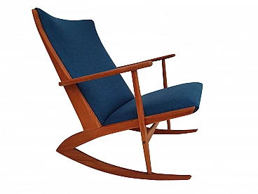 Holger Georg Jensen, Danish rocking chair. Manufactured at Tønder Furniture Workshop in about 1960. Completely renovated, reupholstered in quality blue wool fabric by furniture craftsman. Solid teak wood Wood components has no defects, but it may show slight traces of use. This vintage item is in very good condition because it has been refreshed through new upholstery and refinishing.