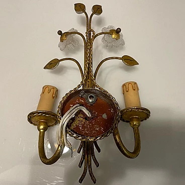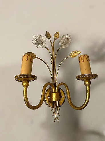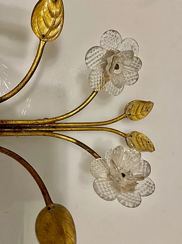 Gold-plated Italian wall sconce with Murano flowers, gilded metal frame. Handmade transparent flowers with Murano glass leaves. E14 bulbs. Wiring compatible with UK, USA and Europe. Height 35 cm Width 23 cm Depth 18 cm