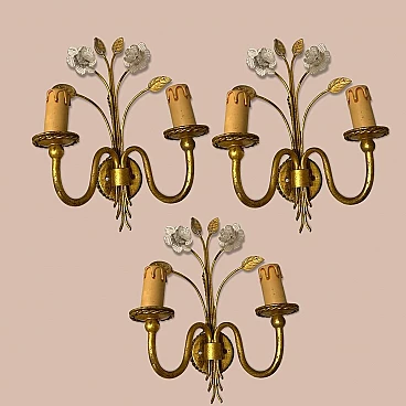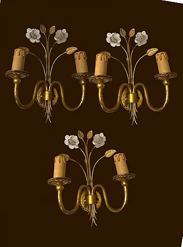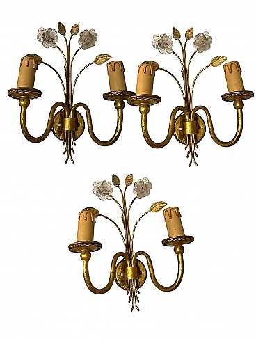 3 Gold-plated Murano glass wall sconces, 1980s