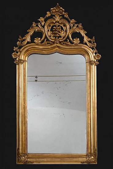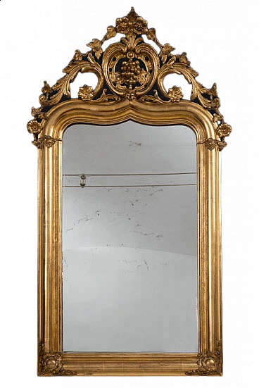Antique gilt and carved wooden mirror from the second half of the 19th century. The curved edge is interspersed with finely carved spiral wands. The cymatium is a triumph of racemes and fairy flowers interspersed with bunches of grapes. The mirror is a mercury mirror original to the period. Provenance: France, Louis Philippe era (1850/60). Measurements: 85xH148cm. Document: Certificate of Authenticity.