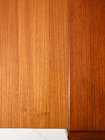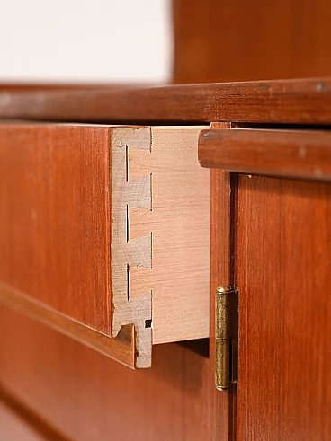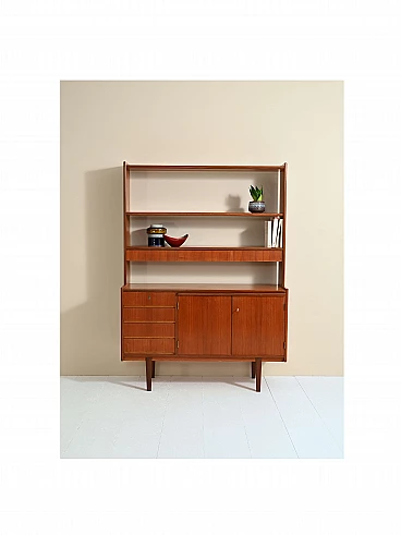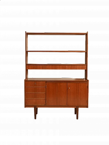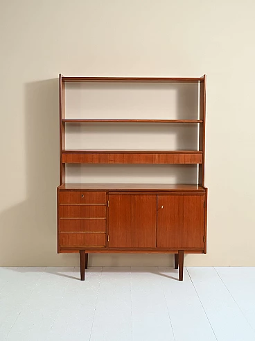Danish teak furniture from the 1960s. The upper part of the bookcase has an adjustable height shelf and a shelf with drawers. The lower part is a cupboard with drawers and a storage compartment. There is also a pull-out shelf that is useful as a desk or laptop holder.