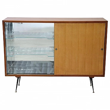 Beautiful particular bar cabinet for living room design Italian '60s. Sliding doors on one side of the cabinet has a glass door with internal compartment for storing bottles with exposed mirror on the bottom, the other door instead is wood interior suitable for storing glasses. Truly characteristic perfect for modern and vintage environments. Used small signs of wear. Negotiable price also send your proposal to purchase.