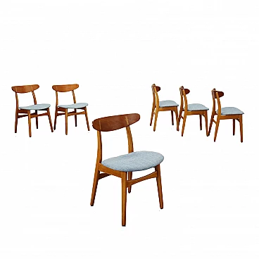 Set of six CH30 chairs by Hans Wegner for Carl Hansen & Son, 1950s-60s. Teak structure with curved back and fabric-covered seat, recently restored. They have the production mark under the seat.