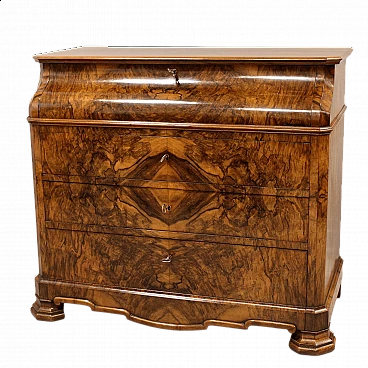 Chest of drawers in solid wood and walnut briar veneer from the mid-19th century. The piece of furniture has been restored and comes with a certificate of authenticity.