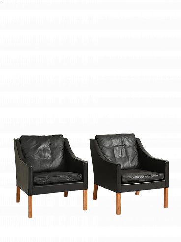 Pair of black leather armchairs designed by Borge Mogensen in 1962 and produced by Fabricia Stolefabrik. Comfortable chairs with a timeless design. Good quality leather and solid oak legs. Dimensions: Height: 84cm/33.07" Seat height: 42cm/16.53" Width: 69cm/27.16" Depth: 84cm/33.07" Good condition - The leather on one of the seats is worn - May show signs of age. Please pay attention to the photographs.