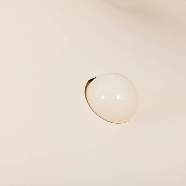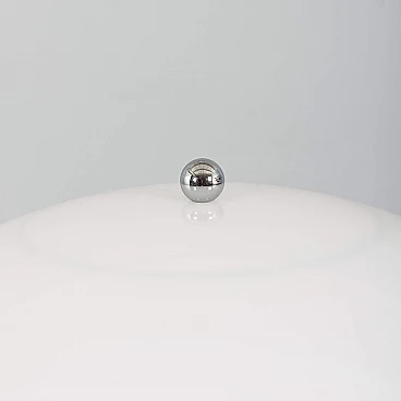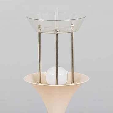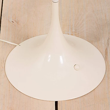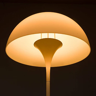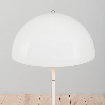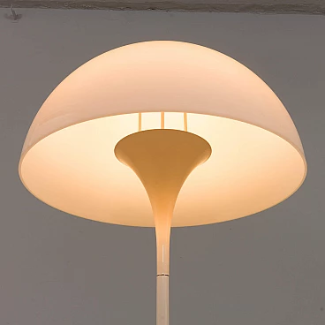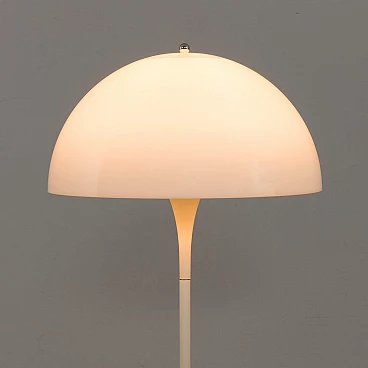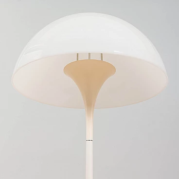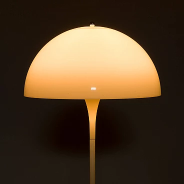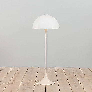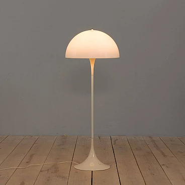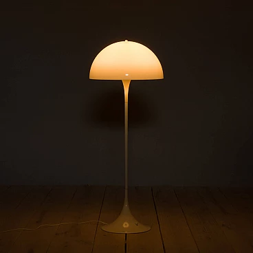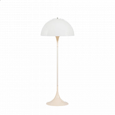 Panthella is a very famous historical white floor lamp, designed by Verner Panton in 1971 for Louis Poulsen. The light source of the lamp is hidden under a hemispherical lampshade in milky white acrylic and a trumpet base. The organic shape is typical of Panton's design. The lampshade projects the light downwards and the material of the lamp causes the light in the room to be diffused from the entire surface of the lampshade.