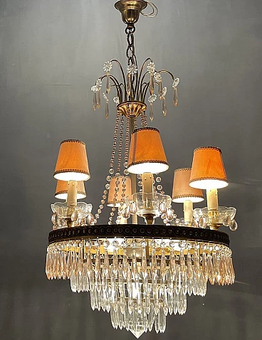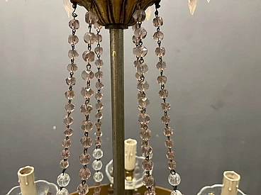 Italian Murano crystal chandelier from the 1950s. Bronze frame. Pink and transparent crystals pendant with lavender-coloured Murano glass drops on crystal bobeches. 13 lights. Requires E14 screw bulbs. Height, including chain and ceiling canopy: 98 cm. Width: 50 cm Depth: 50 cm Height without chain and ceiling canopy: 75 cm Please send a message if you wish to lengthen or shorten the chain. The height can be shortened or lengthened according to your requirements. This chandelier has been restored; the missing crystals have been replaced with original crystals from the same period. The original cream silk lampshades are included.
