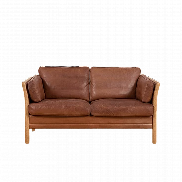 Two-seater aniline leather sofa with oak frame by Mogens Hansen, 1970s