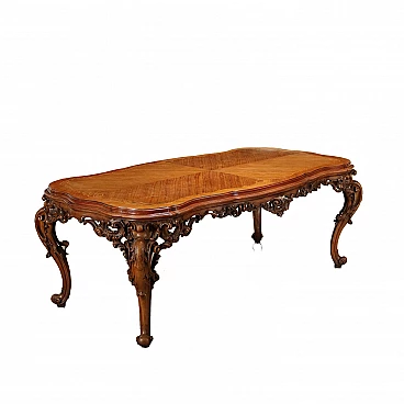 Chippendale-style table in exotic woods, Italy 20th century. Shaped top with quadripartite reserve enclosed within phytomorphic maple perimeter inlay, under-top band and legs richly carved with leaf volutes and rocaille elements. Stiffened legs. Shortcoming.