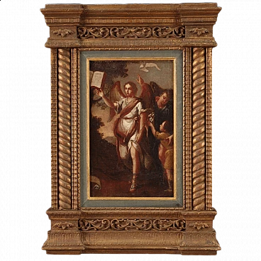 Oil on canvas Tobiolo and the angel with gilded wooden frame, 18th century