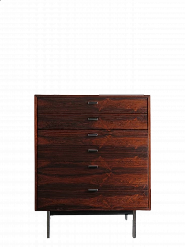 Rosewood chest of drawers designed by Jack Cartwright and manufactured by Founders Furniture, chromed metal legs and painted metal handles, USA 1960s.