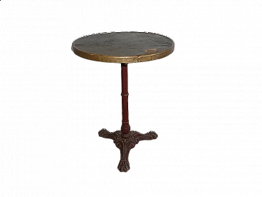 Antique round bistro table. Early 1900s period Small bistrot table with cast-iron foot. Round wooden top with brass edge. Above the top glued an original painted cloth with a lack. Small tables of this type were in use in French bistros in the early 1900s. In good overall condition not restored Top diameter 55 cm. Height 74 cm.