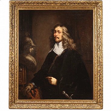 Late Baroque painting of the german school done in oil on canvas depicting celebrated painter Joachim Von Sandrart (1606-1688) ancient copy of the self portrait now in the Uffizi in Florence. Good to the anonymous painter in being able to replicate Sandrart's masterpiece in minute detail, from the marble sculpture to the sword hilt. Work of great quality adorned with antique non coeval gilded wooden frame. Painting of beautiful size and great decor for antique dealers, interior decorators and collectors of antique portraits. Work that has undergone conservation restoration, rintelo, frame replacement and color restoration in some places. Painting in good condition.