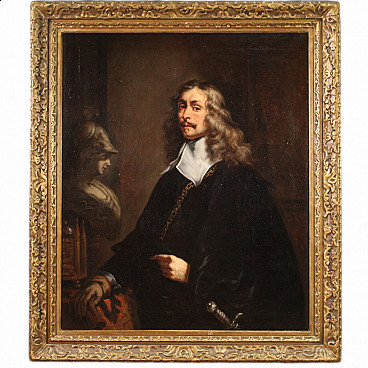 Late Baroque painting of the german school done in oil on canvas depicting celebrated painter Joachim Von Sandrart (1606-1688) ancient copy of the self portrait now in the Uffizi in Florence. Good to the anonymous painter in being able to replicate Sandrart's masterpiece in minute detail, from the marble sculpture to the sword hilt. Work of great quality adorned with antique non coeval gilded wooden frame. Painting of beautiful size and great decor for antique dealers, interior decorators and collectors of antique portraits. Work that has undergone conservation restoration, rintelo, frame replacement and color restoration in some places. Painting in good condition.