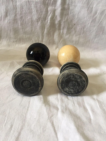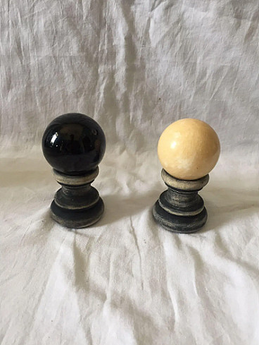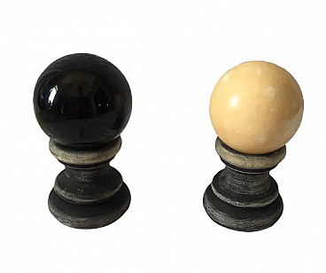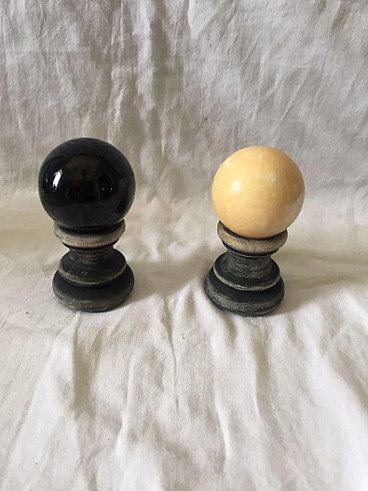 Pair of mid-century modern marble spheres mounted on pickled wooden bases in shades of black and beige. They were made in Italy in the 1960s. The diameter of the balls is 1.97 inches.