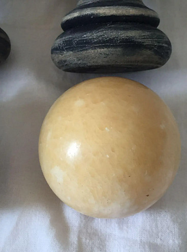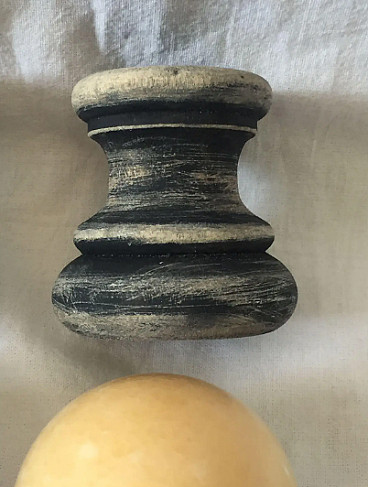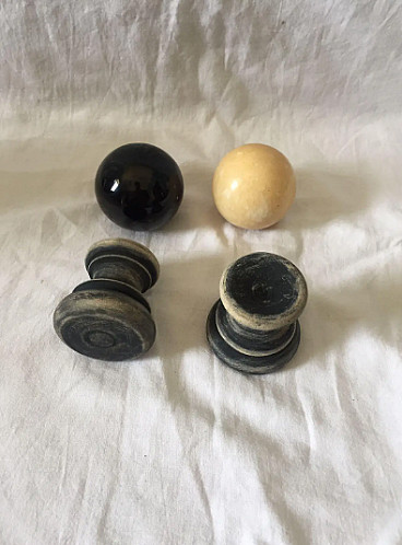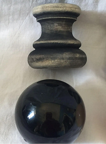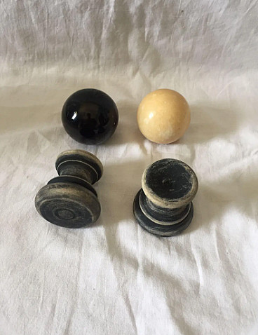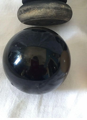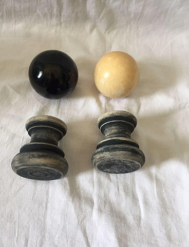 Pair of marble spheres on a black and beige wooden base, 1960s