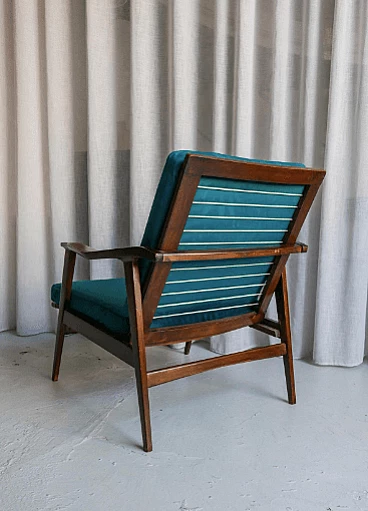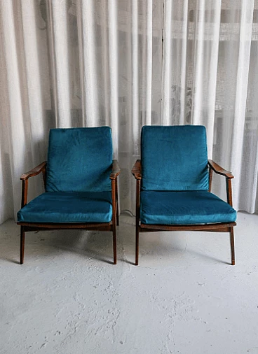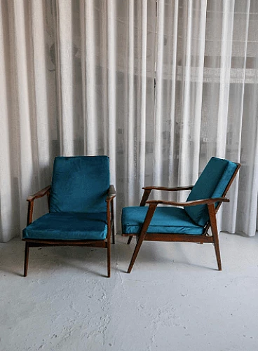 Pair of teak recliners with lightly upholstered cushions in blue velvet. Anonymous but extremely refined in design and detail, produced in the 1960s by a fine Italian manufacturer.