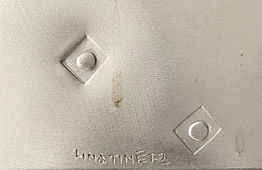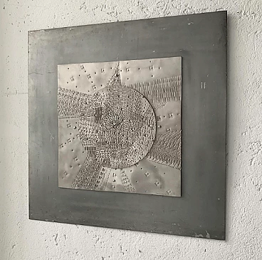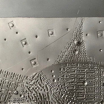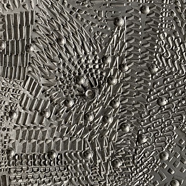 Here is an uncommon work of art by a lesser-known Italian artist, Lino Tiné. Made from three sheets of steel, each decorated with a different motif, this abstract sculpture has a beautiful textural appearance. The metal sheets are scratched, hammered, punched and so on to create abstract patterns and textures reminiscent of mechanical stamps and tyre marks. The orderly surface of the steel has been altered by Tiné through the use of a wide range of different tools such as drills, hammers, scalpels, saws that have left marks capable of evoking a broader vision in which the artistic intent is made clear and evident. Spending time in contemplation of this piece, running your fingers over the metal surface and scrutinising every dent and chamfer with a keen eye, the sculpture will never cease to amaze you. The sculpture comes with four different pins, positioned by the author to allow it to be hung in four different directions, emphasising the fact that the work is open to personal interpretation. It is signed in the bottom right-hand corner of the central sheet LINO TINE 72, indicating the creation of the work in 1972. The work is preserved in good condition despite its age.