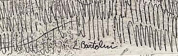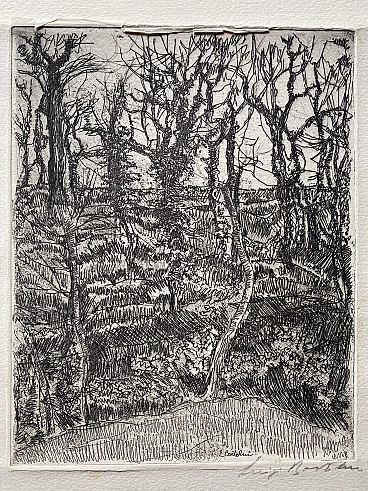 Luigi Bartolini (Cupramontana 1892 - Rome 1963) Ceded Wood. Etching dimensions: mm 220 x 175; sheet mm 496 x 352 Italian painter, writer, scriptwriter and engraver. After his technical studies in Jesi, he moved to Siena in 1907, where he enrolled at the Institute of Fine Arts. In 1909, we find him in Rome, where he attended the Academy of Fine Arts and classes in anatomy, art history and literature at the University. At the Academy of Spain, in San Pietro in Montorio, he attended drawing courses and studied Goya's engravings. Between 1913 and 1914, he was in Florence, where he attended architecture and anatomy classes and the nude school attached to the Academy; he was impressed by Giovanni Fattori's engravings and, at the Uffizi, he studied the collections of antique drawings and etchings by Rembrandt and Callot. With Bartolini, engraving once again became a means of poetic expression, free from the symbolism and Vedutism then in vogue at the academies. The artist, strengthened by his indomitable freedom of expression and despite being unconventional, is today considered one of the most important contemporary engravers of the 20th century. In his etchings, sometimes a light hatching prevails (blond genre), sometimes a Rembrandt-like search for chiaroscuro (black genre). In the sheet, the woodland landscape is the protagonist. Everything is constructed by means of a nervous and rapid stroke: the loose soil, the shrubs and bushes that grow without leaving any uncultivated space, the winding trunks that grow upwards. Only the area in the foreground, where the signature is engraved, is built up by a broader, undulating and softer mark. Dense chiaroscuro contrasts offer an almost impenetrable piece of nature. Compared to the specimen published on Luigi Bartolini's website, this is a similar plate, but with obvious differences in both the signature - which does not bear the date 1941 - and the engraved sign. Four versions of this subject are known. The first engraved in 1914 or 1915 is published in Emporium in 1940. The second is engraved in the 1940s and bears the signature with the date 1941 reproduced at www.luigibartolini.com . The third plate evidently different in sign and without the date after the signature is like the specimen proposed here, datable according to Porzio to 1943. Finally, a fourth version, which has recently appeared on the market, seems to rework the 1943 version, accentuating the chiaroscuro effect. It should also be noted that the present specimen, as well as those in the second and fourth versions, bear the embossed stamp of the Società per le belle Arti ed Esposizione Permanente di Milano and the embossed stamp 'Luigi Bartolini incisore all'acquaforte' at the bottom centre. Excellent impression, with intense blacks, printed on thick paper with white backing. Excellent state of preservation. Signature in pencil lower right Luigi Bartolini.