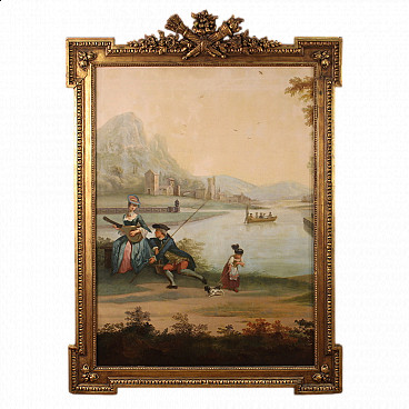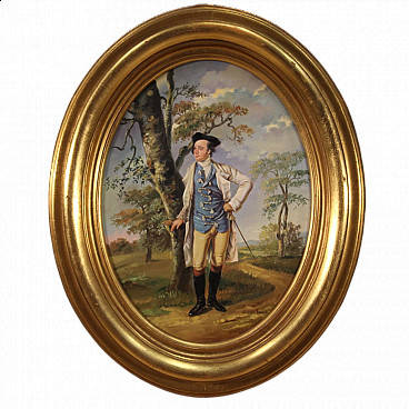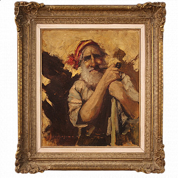 Old Italian painting from the 19th century. Oil on canvas painting depicting Armiger of good painterly hand. Nice size and pleasant decoration for antique dealers, interior decorators and collectors of 19th century paintings. Modern carved and gilded wooden frame with fabric and wooden passe-partout. Work with a difficult-to-read signature in the lower left-hand corner (see photo) under study. Painting of excellent proportions and great character, ideal for inclusion in a salon or study. Work that has undergone conservation restoration, re-staining, replacement of the frame and repainting in places (see photo). In good condition with some minor signs of time. Painted light H 58 x W 37 cm.