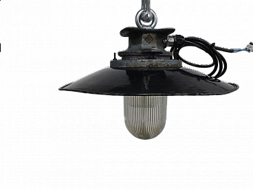 Outdoor lamp in black metal with glass lamp. Possibility of fixing it directly to the ceiling with an extension chain, not supplied. Working fixture. E27 bulb socket.