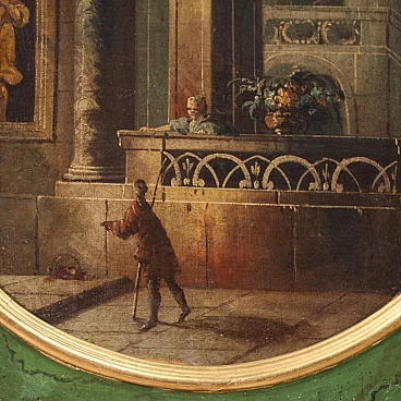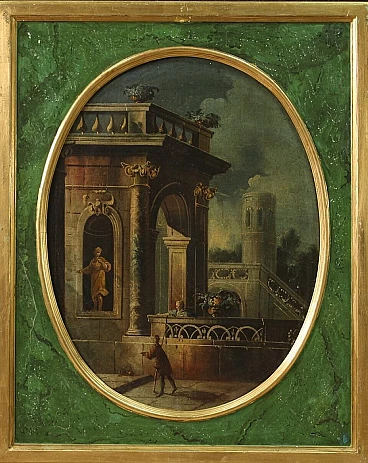 Old Italian painting from the 18th century. Oil on canvas work (glued on panel) depicting pleasant whimsy, view with architecture and characters of good painterly hand. Modern carved wooden frame, lacquered imitation marble and gilded with fabulous decoration. Beautifully sized painting, oval in rectangular frame, ideal for inclusion in a salon or study. A work of good luminosity finished to the finest detail, for antique dealers and interior decorators. Canvas that was glued on board during the 20th century. It has also undergone conservative restoration and colour restoration in places (see photo). Painting part of a pendant (see photo and ask for block price if available). In good condition with some signs of time. Light painting H 70 x W 53 cm