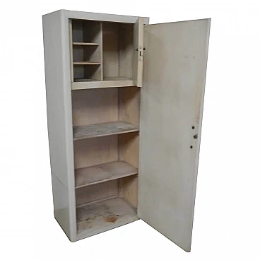 Cabinet in white lacquered compressed wood and fir. In the upper part there is a compartment with divider and 2 small shelves while in the lower part there are 2 shelves. Black colored plinth. Cabinet missing key but in good condition despite signs of use.