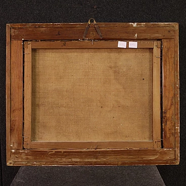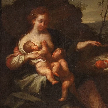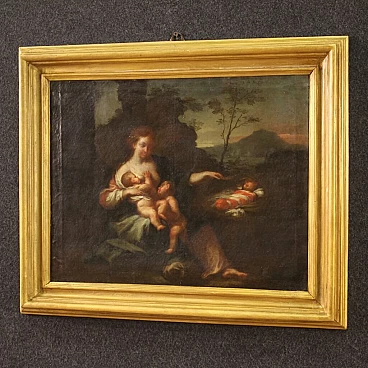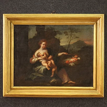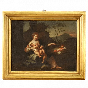 Old Italian painting from the 18th century. Oil painting on canvas depicting The Allegory of Motherhood, landscape with female figure and children by an excellent painterly hand. Non-coeval carved and gilded wooden frame (gilded in the 20th century). A painting of beautiful size and proportion that can easily be placed in various parts of the house. Work depicting two children playing at their mother's breast and a third child in a basket on the right (see photo). A painting of great elegance and refinement, for antique dealers and collectors. Work that has undergone conservative restoration during the 20th century. In good condition. Light painting H 47 x W 60 cm.
