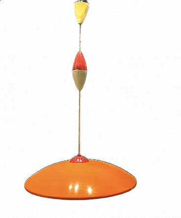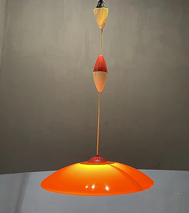 Mid-century orange plastic chandelier. Features 1 light. Requires an E27 bulb. Wiring compatible with Europe, USA and UK. Height with wire and ceiling canopy 88 cm. Height without wire and ceiling canopy 25 cm. Width 50 cm.