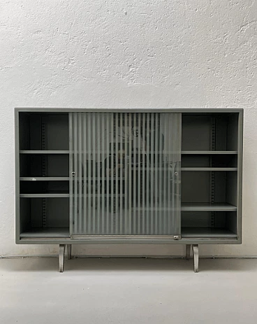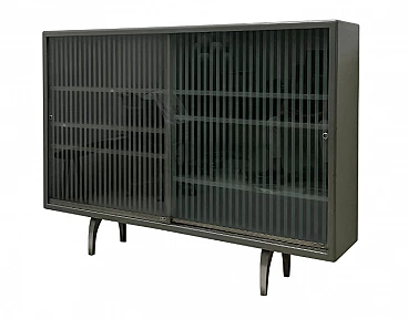 The showcase has six internal shelves that can be arranged and two sliding doors in striped glass.