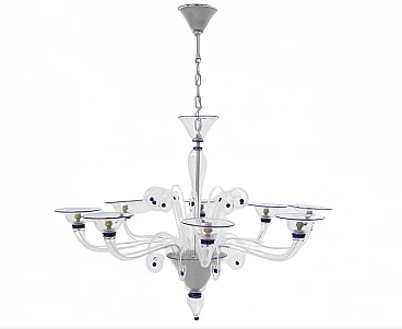 Chandelier made in the 60s with Murano glass. The entire aluminum structure is enclosed in an elegant and sumptuous glass. In the conical lower part there are 8 curved arms that each house a light bulb. The arms widen and shrink sumptuously to then end with a wide opening with a blue border while other glass stems curl up and down to let the light shine even more, ending with a blue spherical tip . This sumptuous chandelier would be perfect for important rooms or for environments that need a touch of elegance.