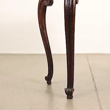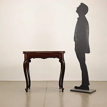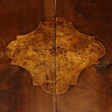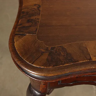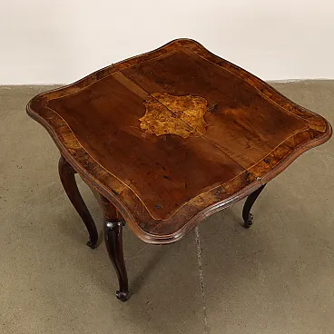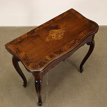 Baroque coffee table in walnut and poplar burl. Folding top with central mirrored geometric design in poplar burl, maple filleting and perimeter border in poplar burl with shaped, gouge carved band. Moved fluted legs ending in curl feet. Bronze hinges.
