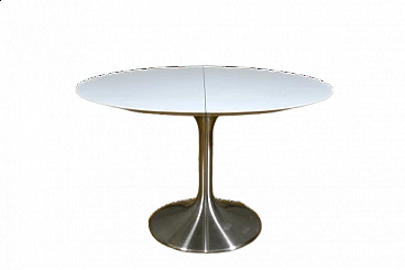 Extendable dining table with central leg designed by Beppe Vida for Ny Form. The table is made of white laminated wood for the top and aluminum for the central leg. The diameter of the closed table is 120 cm, the central extension leaf (to be mounted separately) measures 40 cm, bringing the open table to 160 cm. The laminate top is in very good condition, has a few (minimal) marks as shown in the photos.